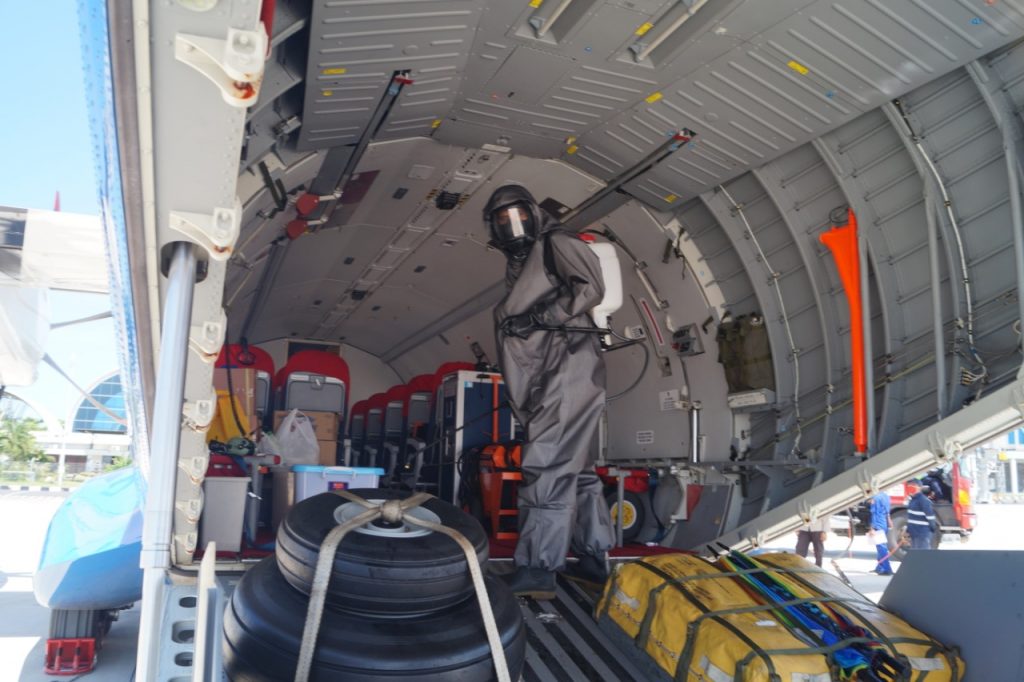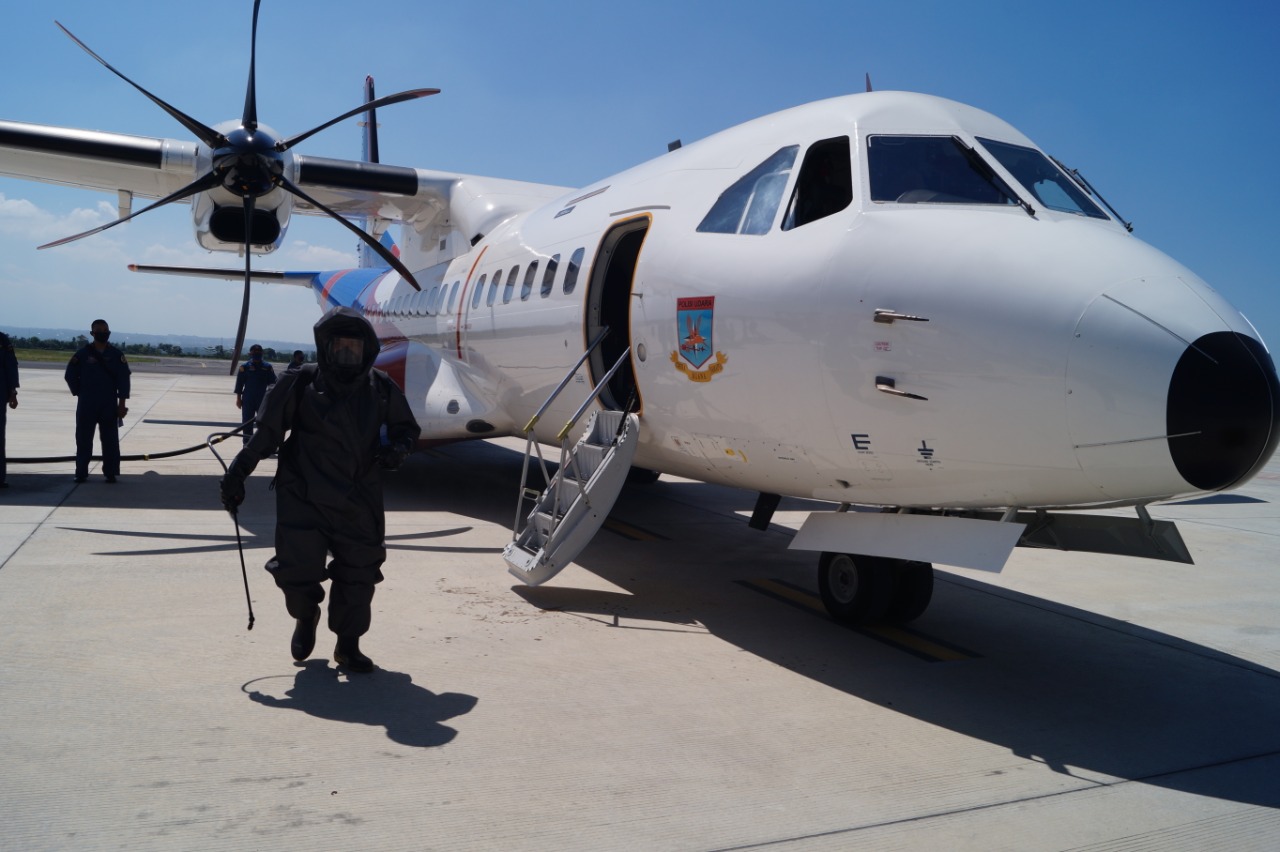 KabarNTB, Mataram – Personel Sat Brimob Polda NTB melakukan sterilisasi dengan penyemprotan cairan disinfektan terhadap pesawat CN-295 milik POLRI yang sebelumnya ditumpangi Kapolda NTB yang baru Irjen Pol M Iqbal dan akan ditumpangi mantan Kapolda NTB, Irjen Pol Tomsi Tohir menuju Mabes Polri di Jakarta pada Senin 11 Mei 2020.