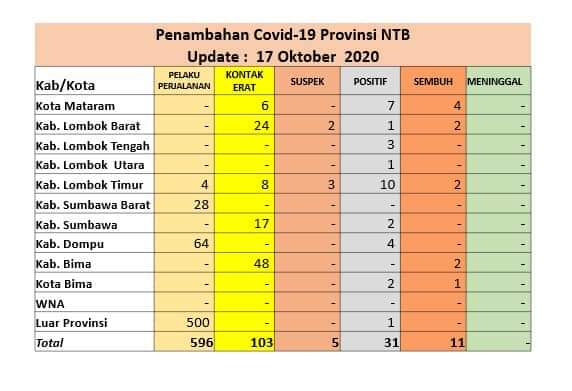KabarNTB, Mataram – Gugus Tugas Covid-19 Provinai NTB mengumumkan penambahan 31 kasus baru positif, 9 orang sembuh dan nihil (0) kasus kematian per hari Sabtu 17 Oktober 2020.