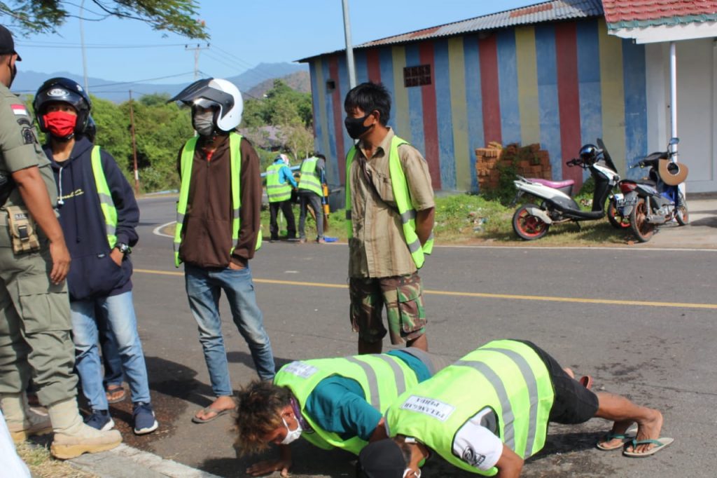 Para pelanggar prokes diberi sanksi pushup oleh Tim Gabungan dalam operasi Yustisi di Sumbawa