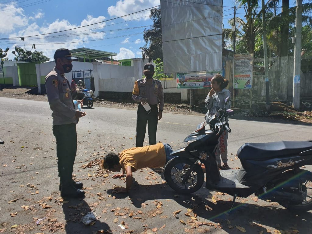 Anggota Polsek Dompu memberikan sanksi pushup kepada pengendara yang tidak mematuhi Prokes dalam operasi yustisi yang digelar Sabtu (10/7)