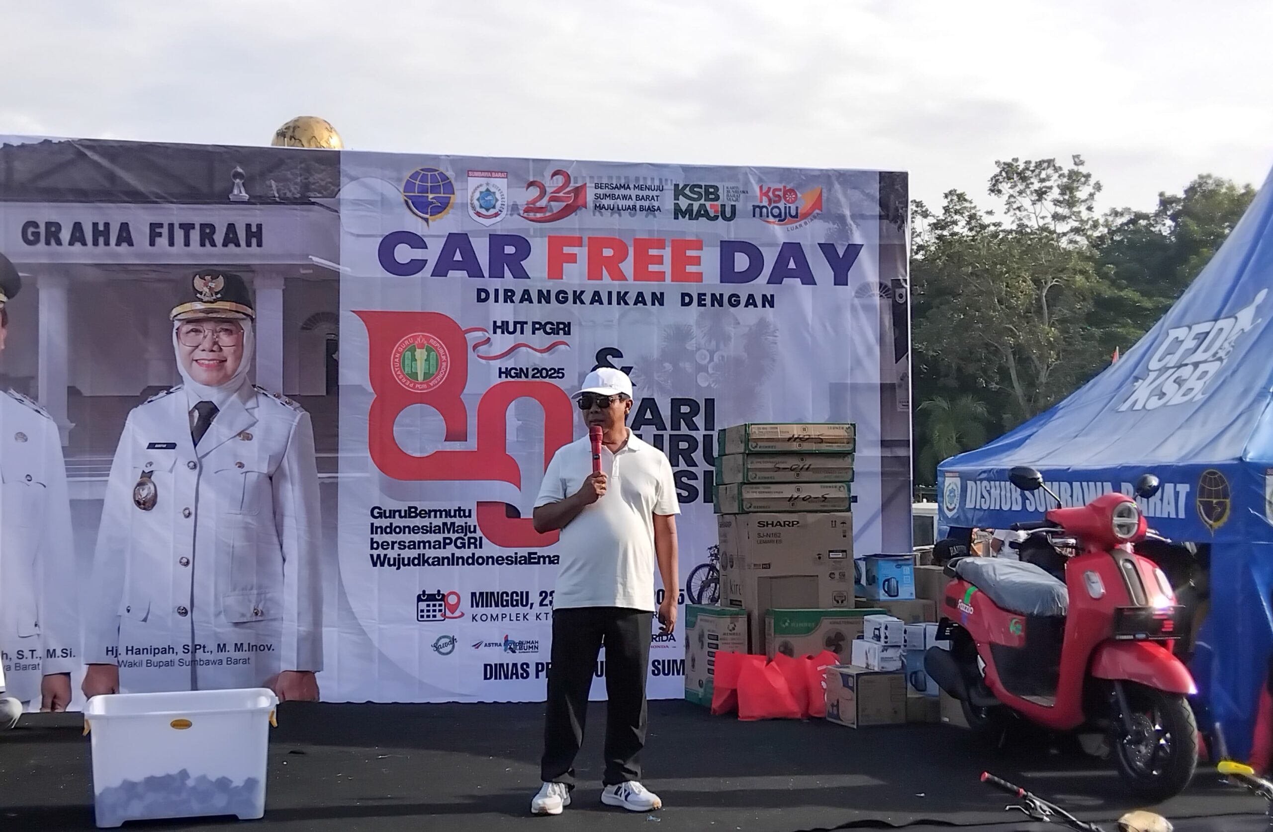 KabarNTB, Sumbawa Barat – Bupati Sumbawa Barat, H. Amar Nurmansyah, bersama Wakil Bupati, Hj. Hanipah Musyafirin hadir langsung dalam kegiatan Car Free Day yang dirangkaikan dengan Peringatan Hari Ulang Tahun Persatuan Guru Republik Indonesia (PGRI) ke-80 dan Hari Guru Nasional (HGN) Tahun 2025. Kegiatan ini dilaksanakan di KTC, Minggu 23 November 2025.