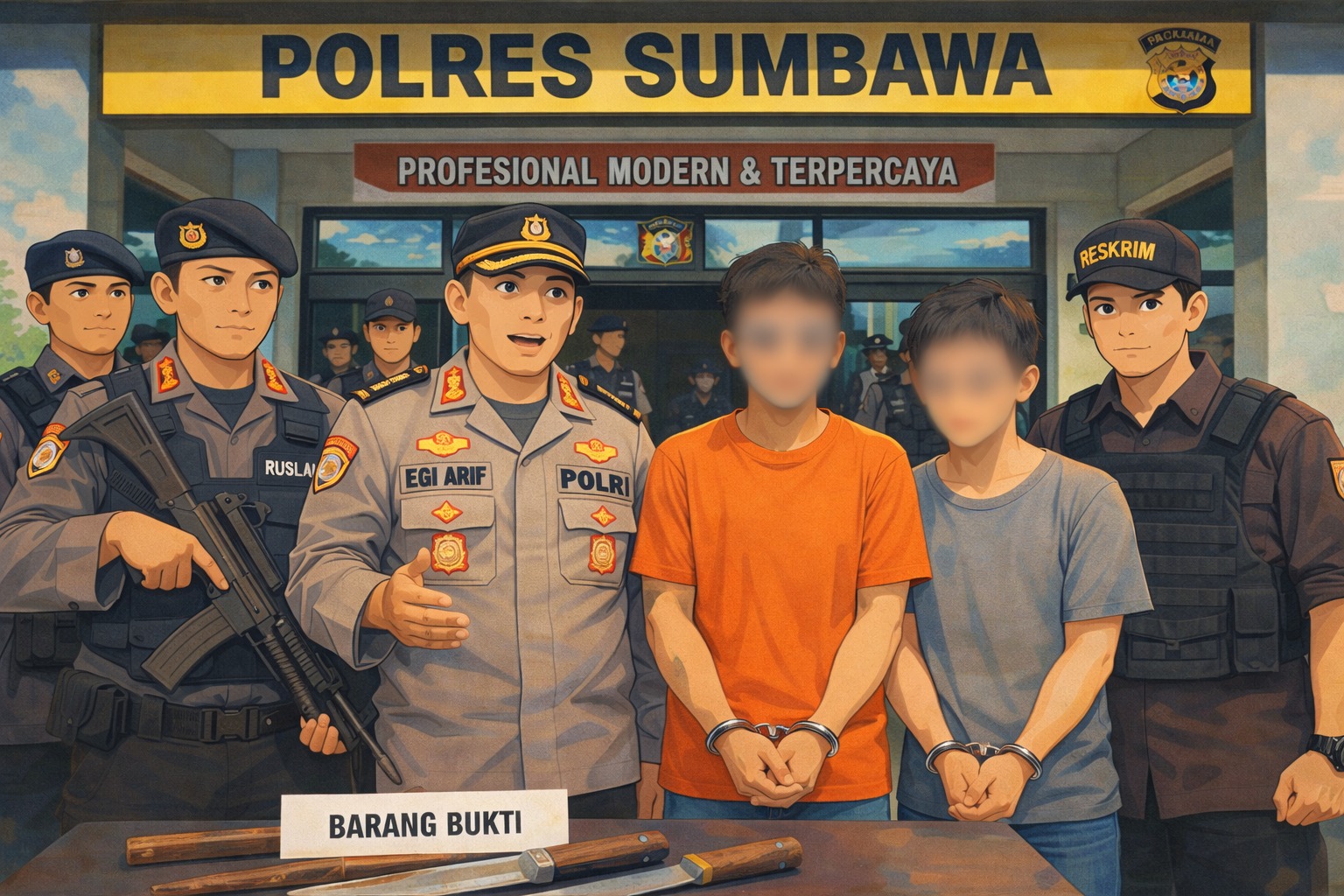 Polres Sumbawa mengamankan dua pria pelaku penganiayaan di Desa Kerato Kecamatan Unter Iwes pada Jumat malam (06/03/2026). Kedua pelaku yang diamankan berinisial SB (37) dan SP (25).